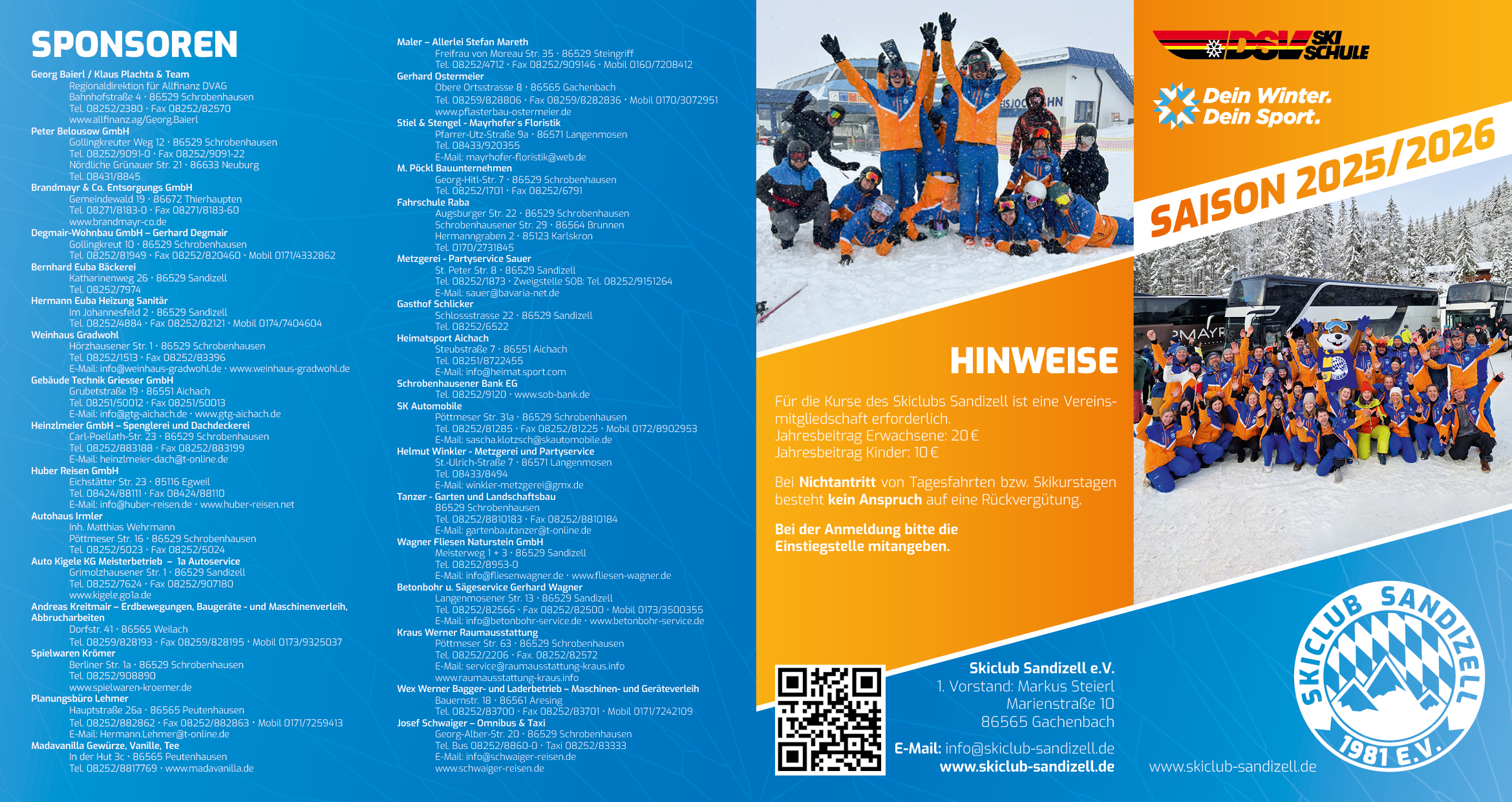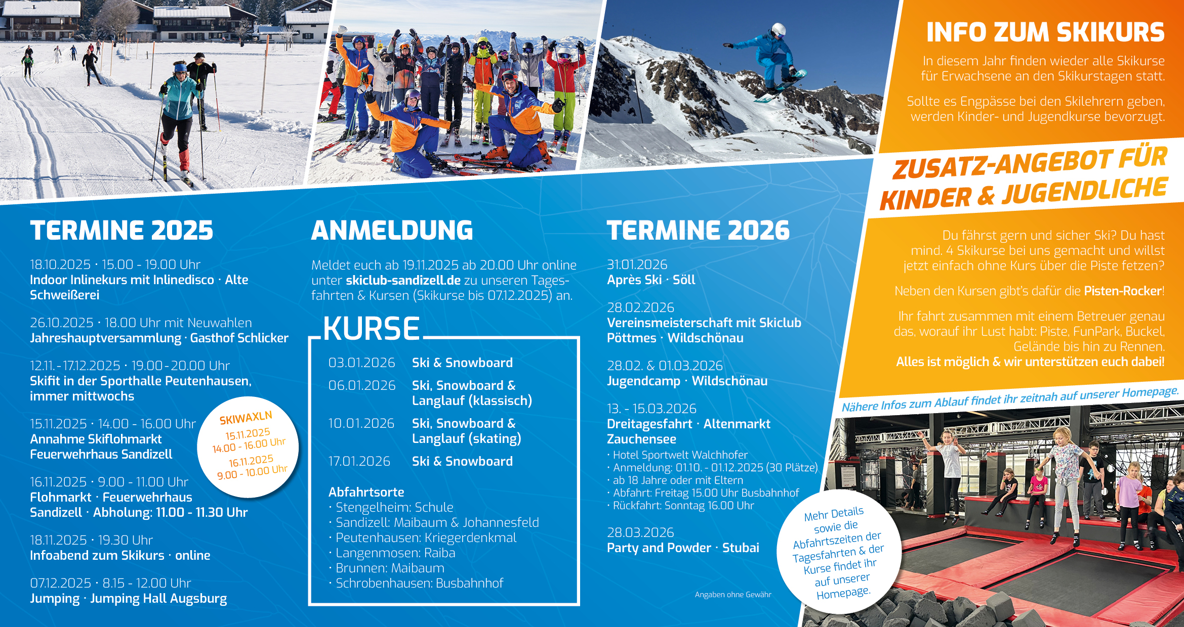 Für alle, die Interesse an einem Skikurs in diesem Winter haben, findet am 18.11.2025 um 19:30 Uhr eine Informationsveranstaltung statt. Die Veranstaltung findet online statt. Der Link zur Veranstaltung wird auf der Website des Skiclubs veröffentlicht (www.skiclub-sandizell.de). Am darauffolgenden Tag öffnet die Onlineanmeldung für die Skikurse ihre Pforten.